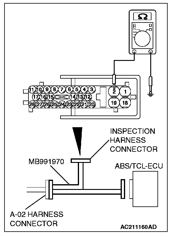 1. Disconnect the ABS/TCL-ECU connector A-02 and connect special tool MB991970 to the A-02 body-side harness connector. Then turn the ignition switch to the "LOCK" (OFF) position and checking resistance and continuity.