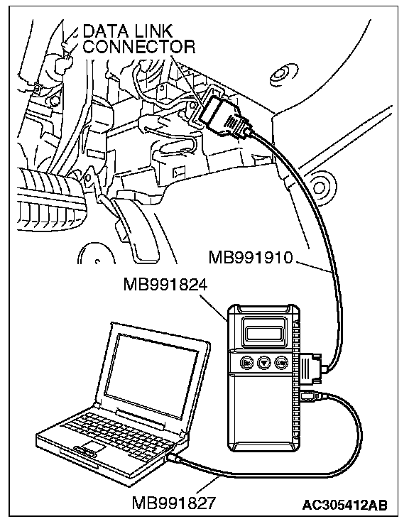 CAUTION: To prevent damage to scan tool MB991958, always turn the ignition switch to the "LOCK" (OFF) position before connecting or disconnecting scan tool MB991958.
