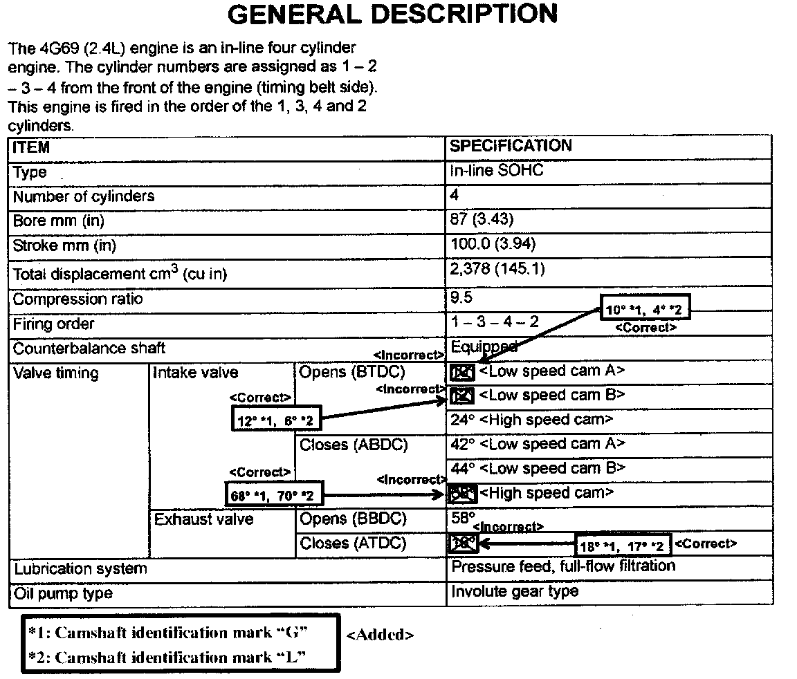 The 4G69 (2.4L) engine is an in-line four cylinder engine. The cylinder numbers are assigned as 1 - 2 - 3 - 4 from the front of the engine (timing belt side). This engine is fired in the order of the 1, 3, 4 and 2 cylinders.