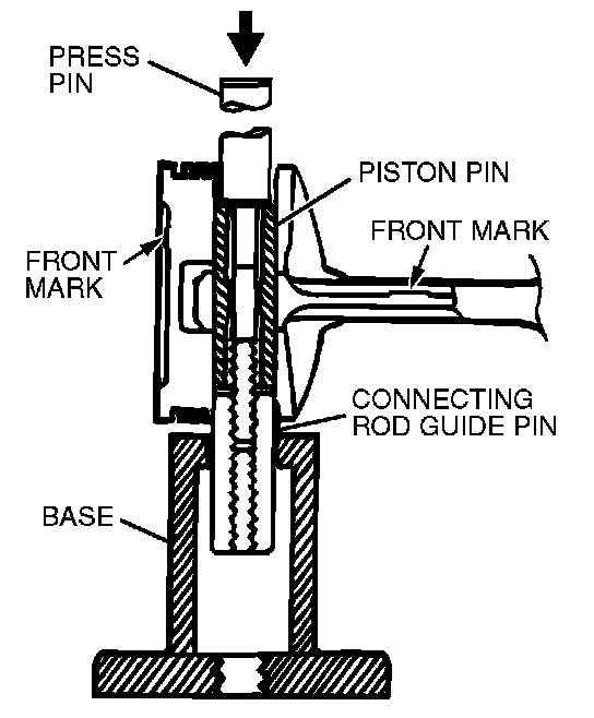 4. Position the piston assembly on the piston support in the press. With the press pin up as shown, insert the guide pin through the hole in the piston and through the hole in the piston support.