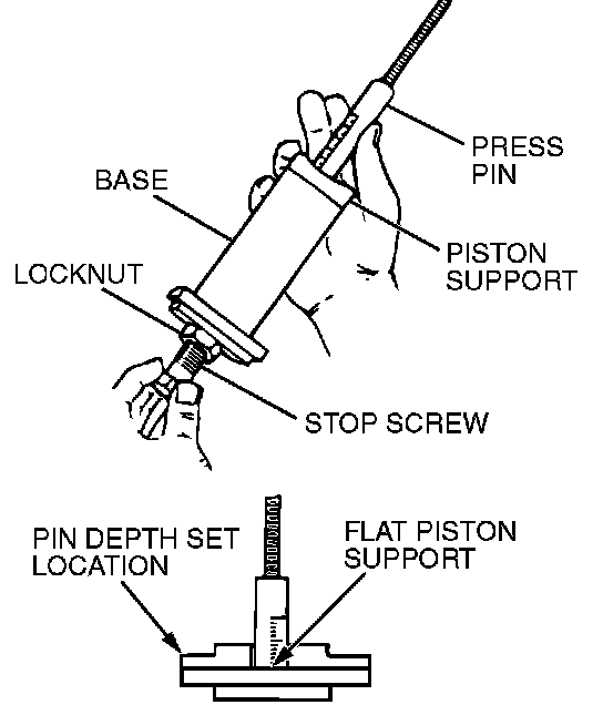 2. Thread the stop screw and lock nut assembly into the base. Fit the correct piston support on top of the base. Insert the press pin, threaded end up, into the hole in the piston support until the press pin touches the stop screw.