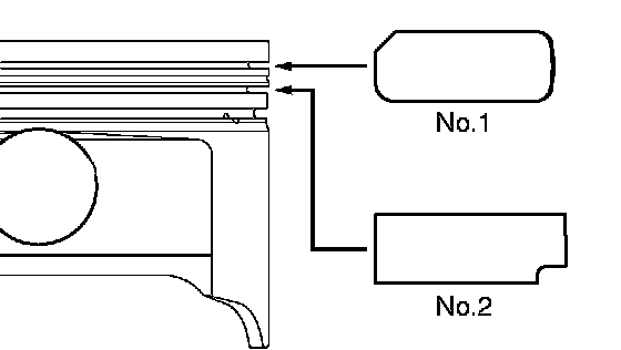 NOTE: Confirm the profile for No. 1 and No.2 piston rings carefully. Install them correctly by paying careful attention to the direction of the top and bottom. The identification mark and the size mark are stamped on the upper plane of the piston ring (piston top side).