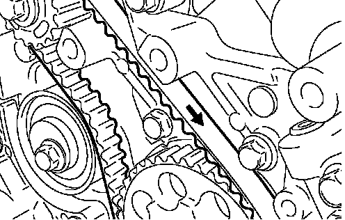 6. Install the timing belt on the crankshaft sprocket, oil pump sprocket, idler pulley, camshaft sprocket, and tensioner pulley in that order.