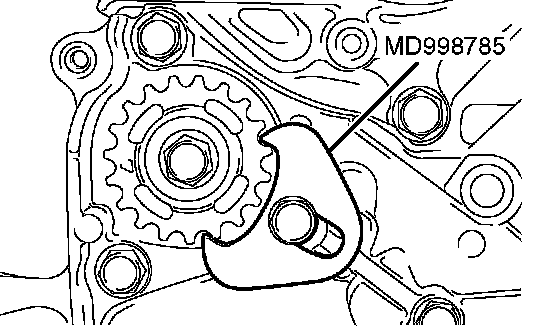 1. Set special tool MD998785 as shown to prevent the counterbalance shaft sprocket from turning together.