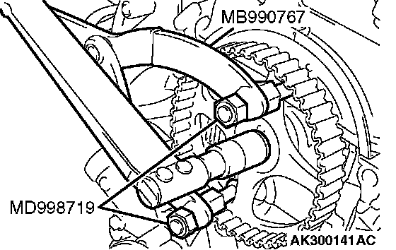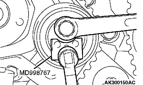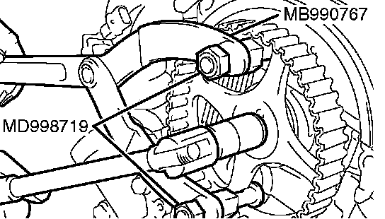 1. While holding the camshaft sprocket with special tools MB990767 and MD998719, loosen the camshaft sprocket bolt.