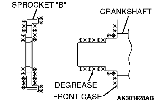 Clean and then degrease the front of the front case, crankshaft sprocket "B" and crankshaft surface on which sprocket "B" is attached.