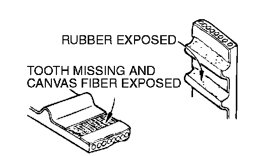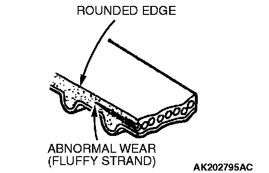 6. Abnormal wear of belt sides. Normal wear is indicated if the sides are sharp as if cut by a knife. Abnormal wear is indicated if the sides are ragged.