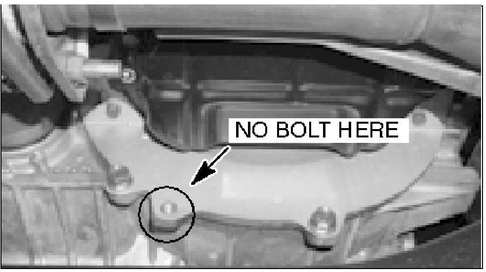 There is an empty bolt hole between the engine and transmission. This is the intended design. A fastener should not be installed at this location.