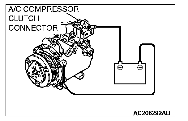 Connect the compressor connector terminal to the battery positive (+) terminal and ground the battery's negative (-) terminal to the compressor unit. At that time, the air conditioning compressor clutch should make a definite operating sound.