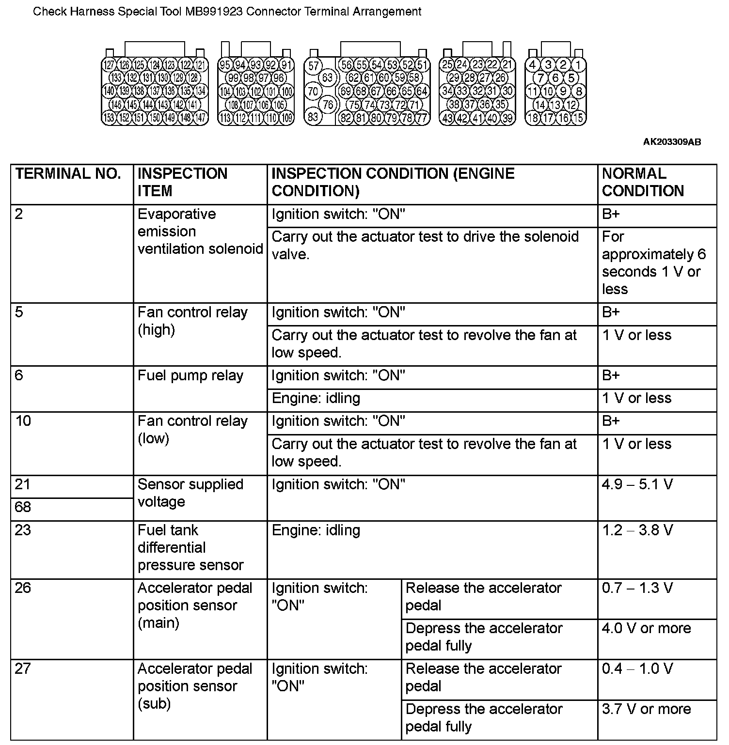 Check Harness Special Tool MB991923 Connector Terminal Arrangement Part 1: