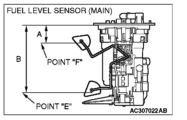 1. Move the float and measure height A at point "F" (highest) and B at point "E" (lowest).