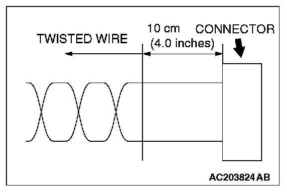 - If the connector or wire on the main bus line or the sub-bus wire is replaced, the strand end of the twisted wire should be within 10 cm (4 inches) from the connector. If it exceeds 10 cm (4 inches), twist the wiring harness just like the original twisted wire. If the strand end exceeds 10 cm (4 inches), noise suppression is deteriorated, causing a communication error.