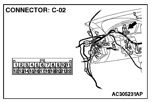 1. Disconnect joint connector (3) C-02 and intermediate connector C-22, and measure the resistance at the wiring harness sides of joint connector (3) C-02 and intermediate connector C-22.