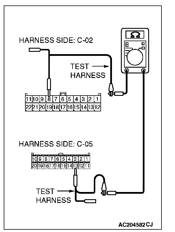 1. Disconnect joint connector (3) C-02 and multi-center display unit (middle-grade type) connector C-05, and measure the resistance at the wiring harness sides of joint connector (3) C-02 and multi-center display unit (middle-grade type) connector C-05.