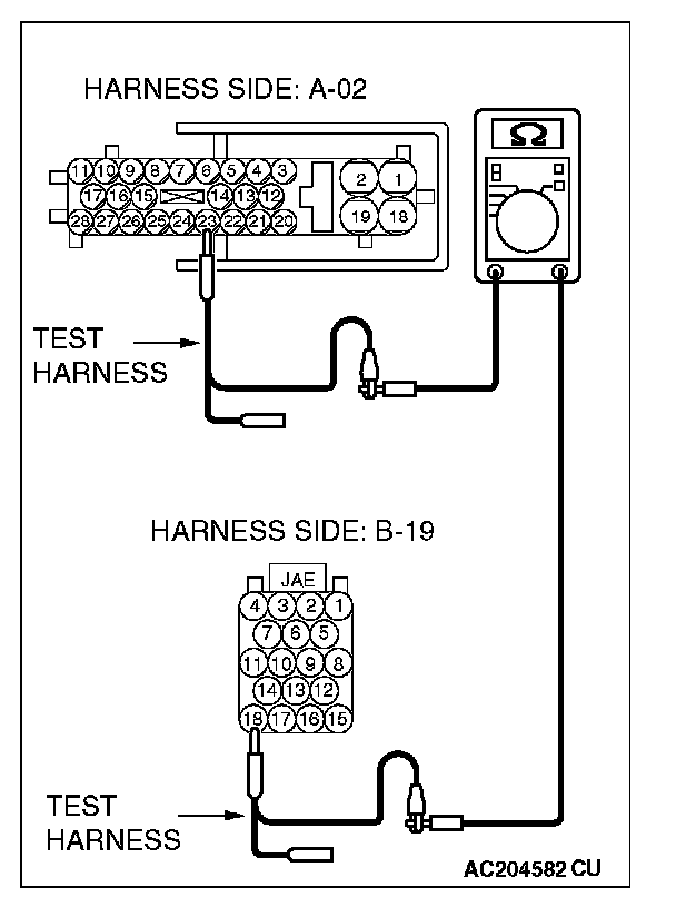 1. Disconnect ABS-ECU connector A-02 and powertrain control module connector B-19, and measure the resistance between each wiring harness side connector.