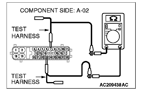 1. Disconnect ABS-ECU connector A-02, and measure the resistance at the component side of ABS-ECU connector A-02.