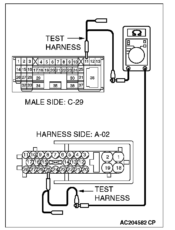 1. Disconnect intermediate connector C-29 and ABS-ECU connector A-02, and measure the resistance between the wiring harness side connector of ABS-ECU connector A-02 and the male side connector of intermediate connector C-29 (at front wiring harness side).