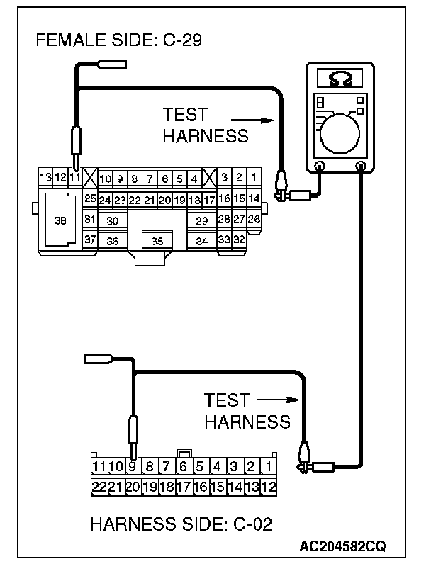 1. Disconnect joint connector (3) C-02 and intermediate connector C-29, and measure the resistance between the wiring harness side connector of joint connector (3) C-02 and the female side connector of intermediate connector C-29 (instrument panel wiring harness side).