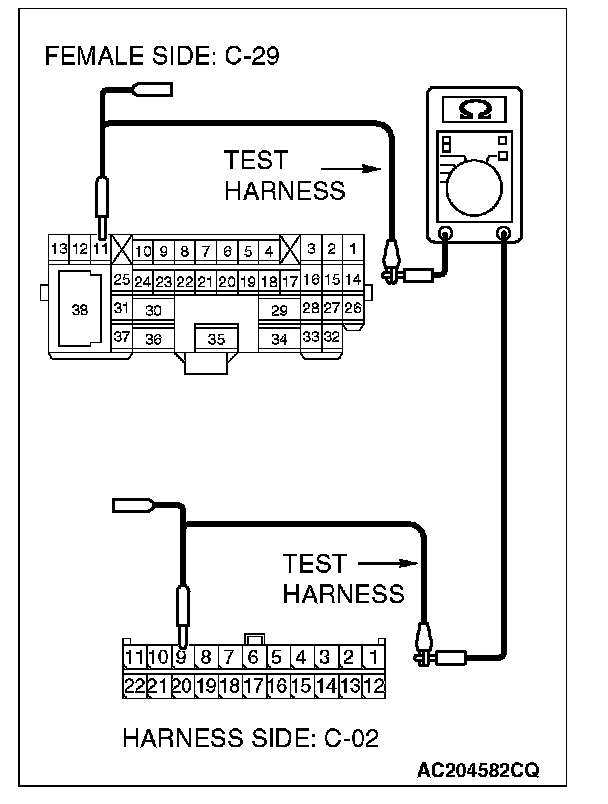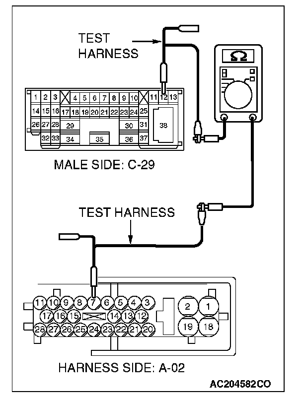 1. Disconnect intermediate connector C-29 and ABS-ECU connector A-02, and measure the resistance between the wiring harness side connector of ABS-ECU connector A-02 and the male side connector of intermediate connector C-29 (at front wiring harness side).