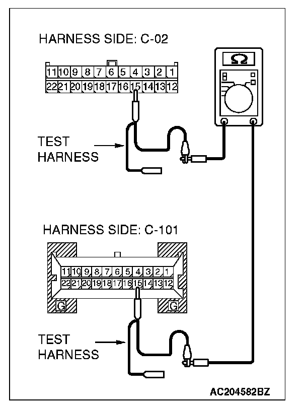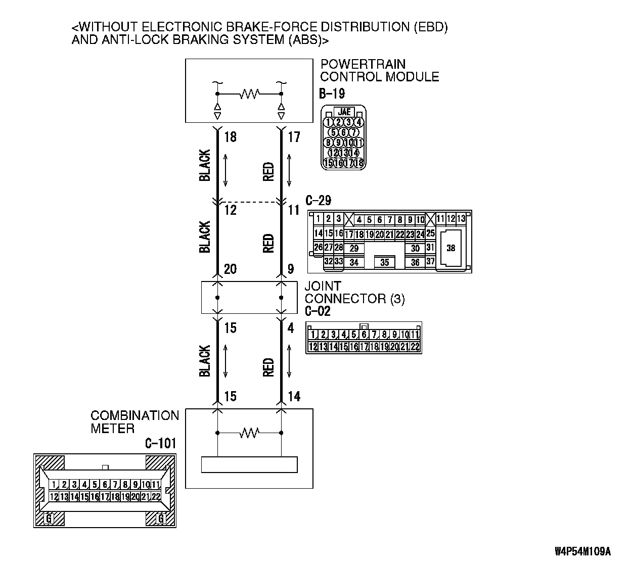 1. Disconnect joint connector (3) C-02 and combination meter connector C-101, and measure the resistance between each wiring harness side connector.