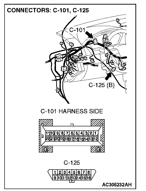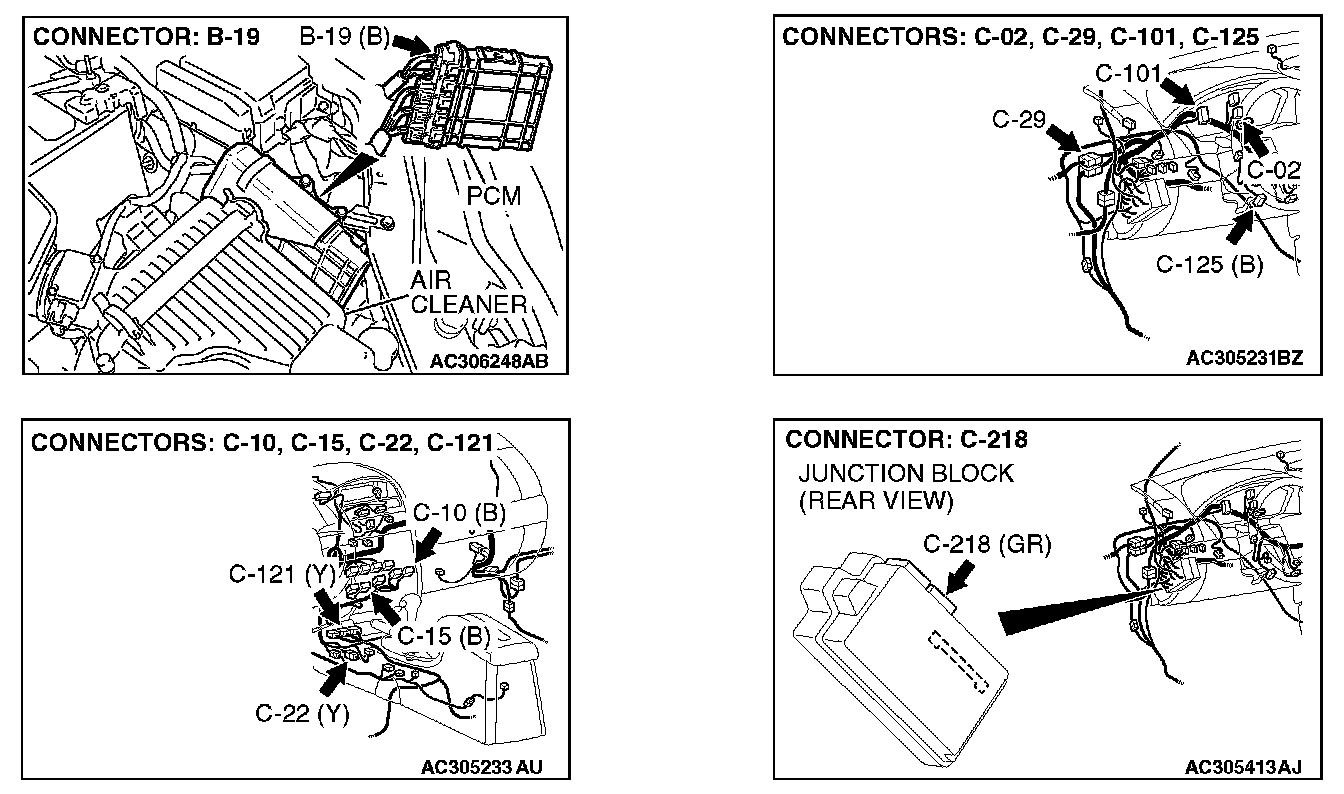 STEP 1. Check powertrain control module connector B-19, combination meter connector C-101 and data link connector C-125 for loose, corroded or damaged terminals, or terminals pushed back in the connector.
