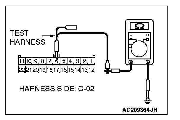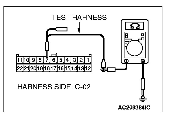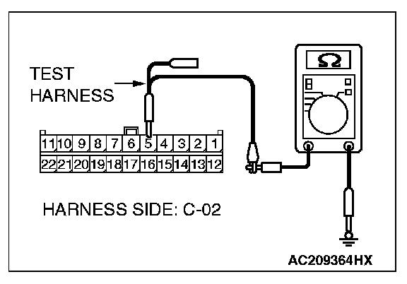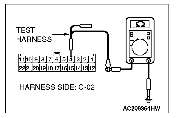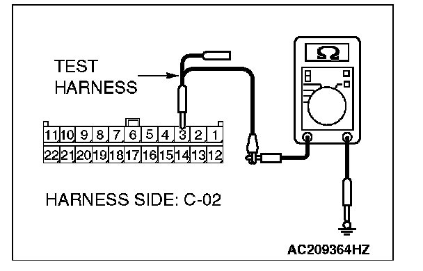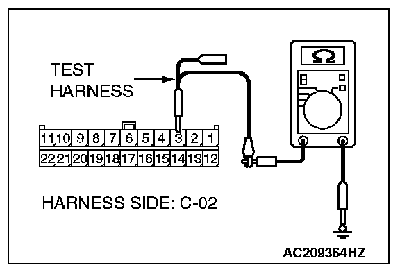 1. Disconnect intermediate connector C-22 and joint connector (3) C-02, and measure the resistance at the wiring harness side of joint connector (3) C-02.