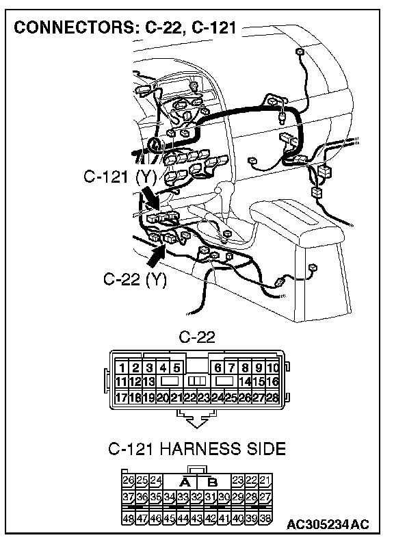 1. Disconnect intermediate connector C-22 and SRS-ECU connector C-121, and measure the resistance at the male side of intermediate connector C-22 (at floor wiring harness side).