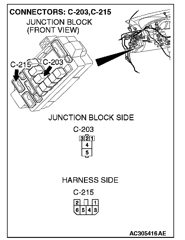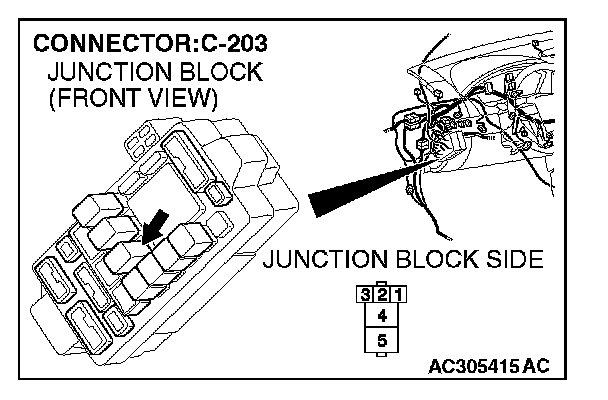 STEP 3. Check power window relay connector C-203 for loose, corroded or damaged terminals, or terminals pushed back in the connector.