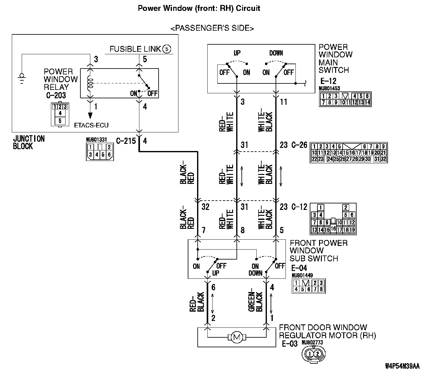 Q : Are front power window sub switch connector E-04 and front power window regulator motor (RH) connector E-03 in good condition?
