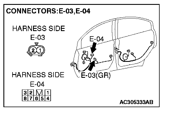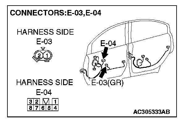 STEP 5. Check front power window sub switch connector E-04 and front power window regulator motor (RH) connector E-03 for loose, corroded or damaged terminals, or terminals pushed back in the connector.
