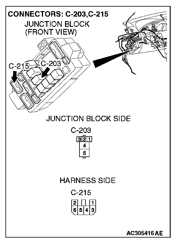 NOTE: Also check junction block connector C-215 and intermediate connector C-12. If junction block connector C-215 or intermediate connectors C-12 is damaged, repair or replace the damaged component(s) as described in Harness Connector Inspection.
