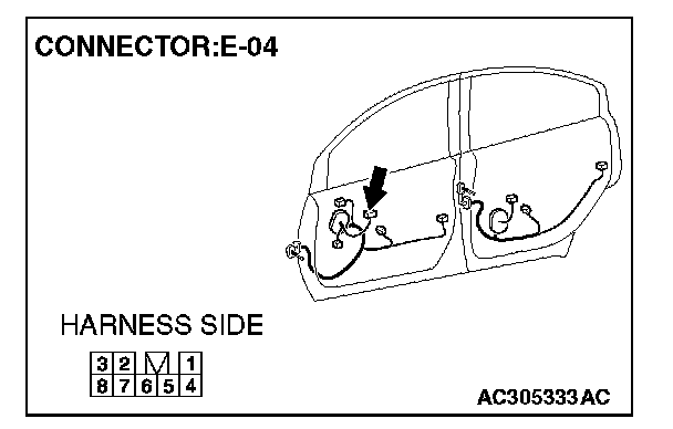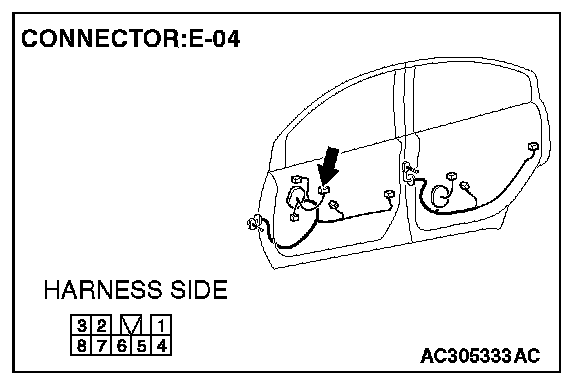 1. Disconnect front power window sub switch connector E-04 and measure the voltage available at the wiring harness side of the connector.