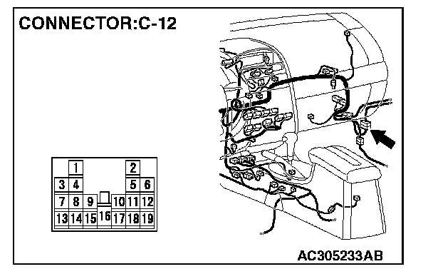 STEP 1. Check power window main switch connector E-12 for loose, corroded or damaged terminals, or terminals pushed back in the connector.
