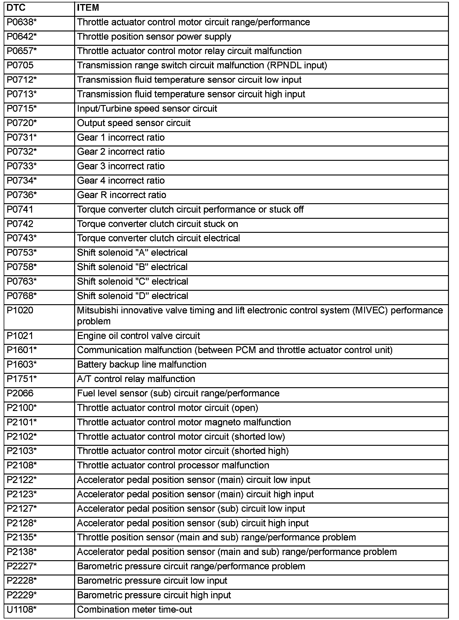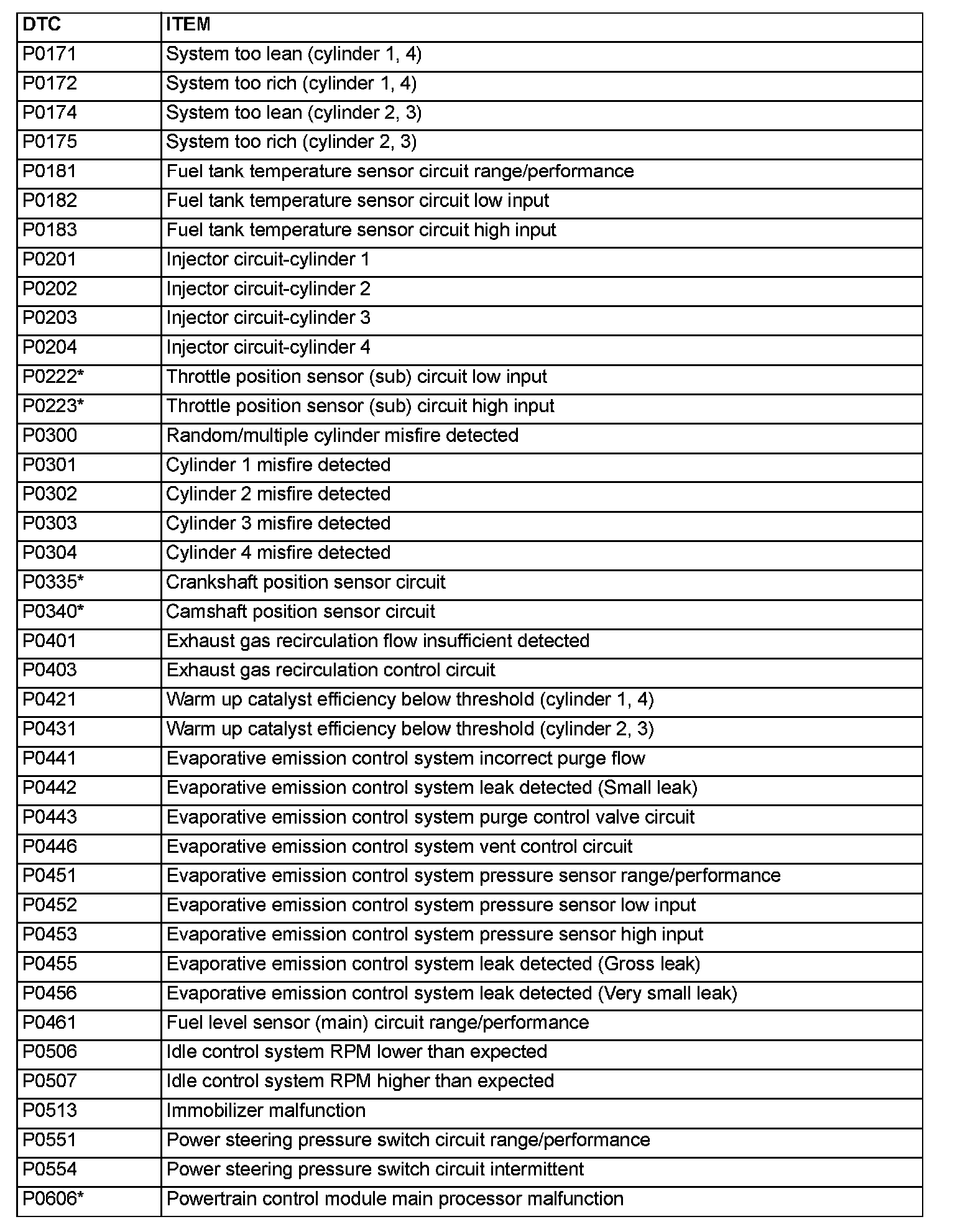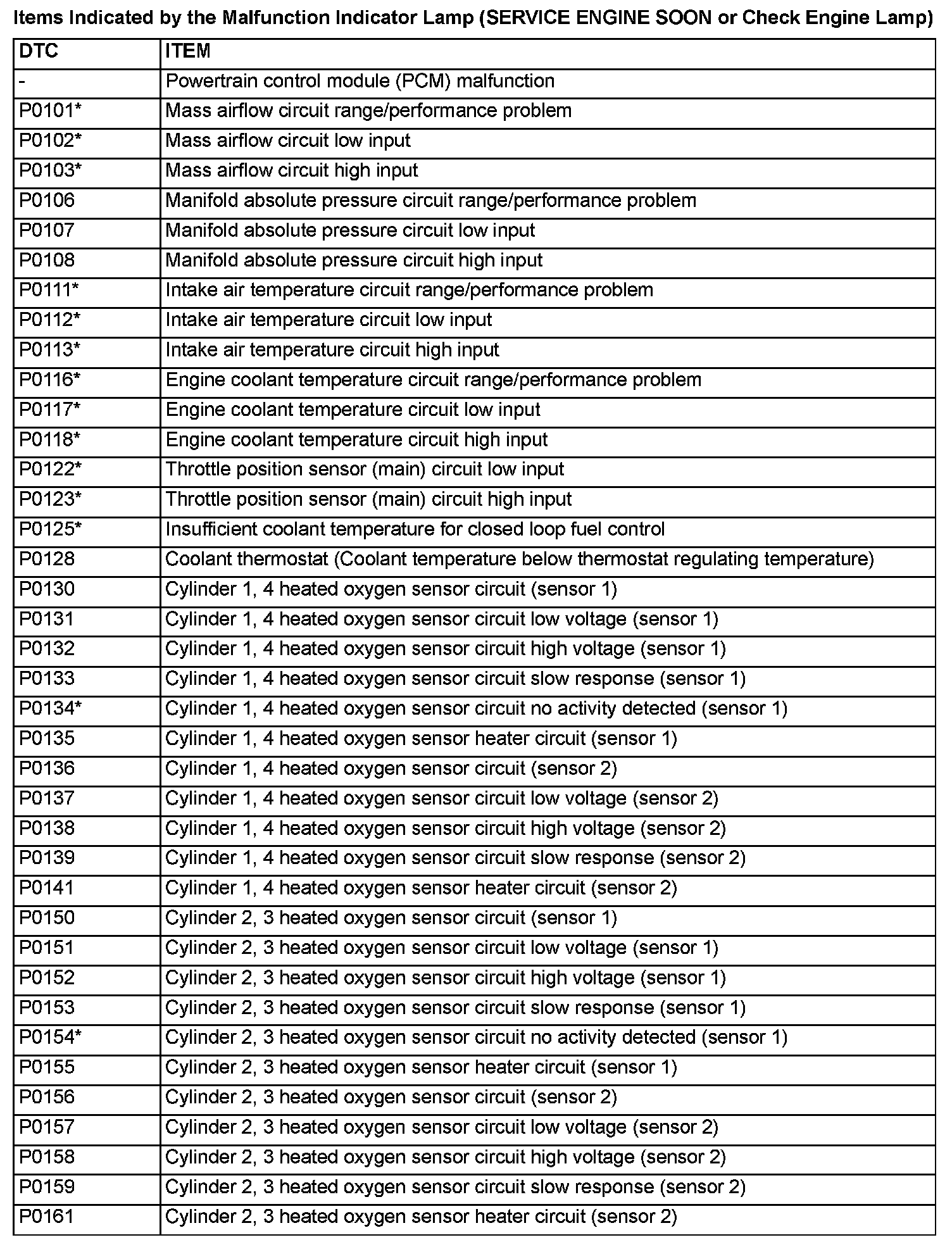 NOTE: After the PCM has detected a malfunction, the Malfunction Indicator Lamp (SERVICE ENGINE SOON or Check Engine Lamp) illuminates when the engine is next turned on and the same malfunction is re-detected. However, for items marked with a "*" in the DTC NO. column, the Malfunction Indicator Lamp (SERVICE ENGINE SOON or Check Engine Lamp) illuminates only on the first detection of the malfunction.