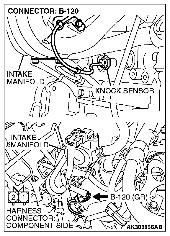 1. The ignition timing should retard more when knock sensor connector B-120 is disconnected than when it is connected.