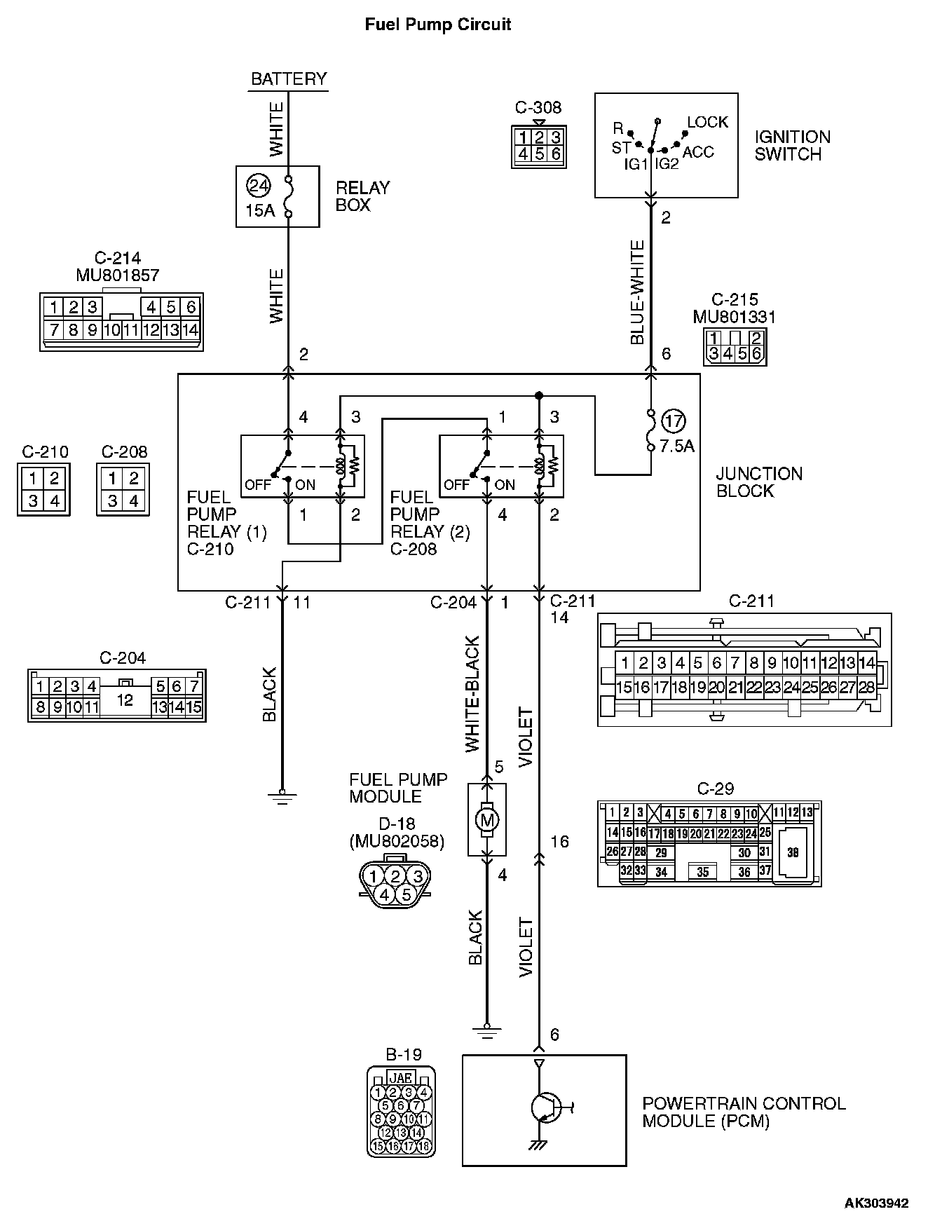 STEP 12. Check for open circuit and short circuit to ground and harness damage between fuel pump relay 2 connector C-208 (terminal No. 4) and fuel pump connector D-18 (terminal No. 5).