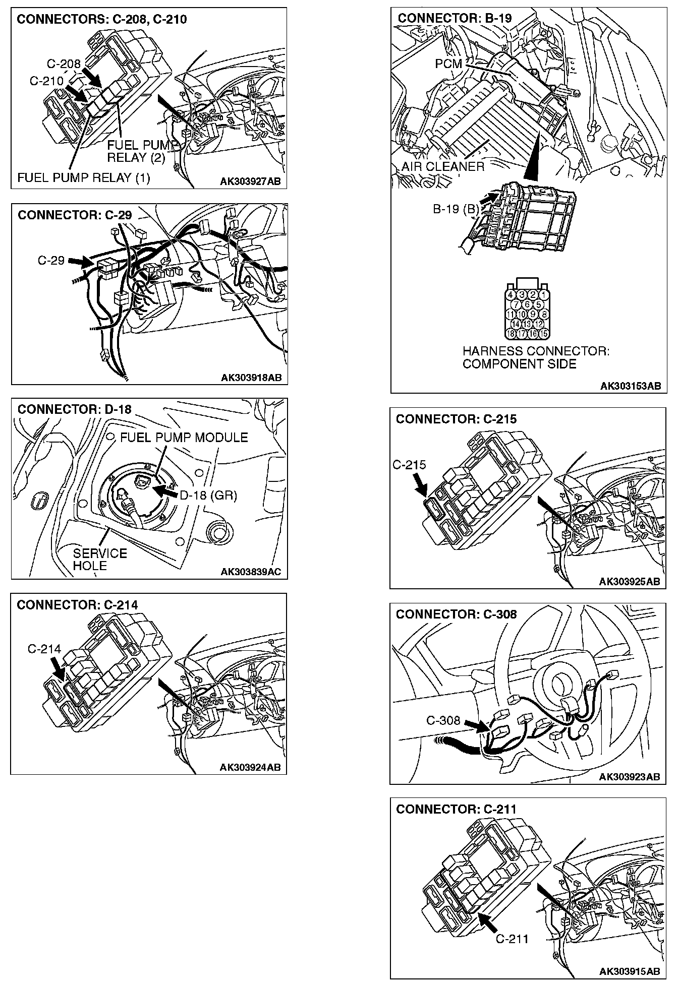 NO: Check harness connectors C-29 and C-211 at intermediate connector for damage, and repair or replace as required. Refer to, Harness Connector Inspection. If intermediate connectors are in good condition, repair harness wire between fuel pump relay 2 connector C-208 (terminal No. 2) and PCM connector B-19 (terminal No. 6) because of open circuit. Then confirm that the malfunction symptom is eliminated.