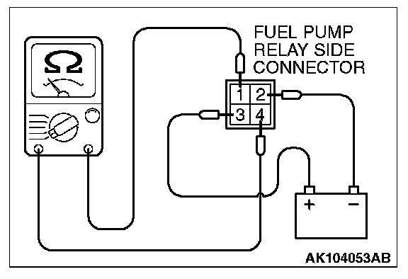 4. Check for continuity between the each fuel pump relay terminals No. 1 and No. 4 while connecting and disconnecting the jumper wire at the negative battery terminal.