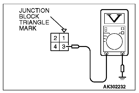 CAUTION: Because it is difficult to distinguish the top and bottom of the fuel pump relay connector at the wiring harness, inspect it by using the triangle mark on the junction block as a reference.