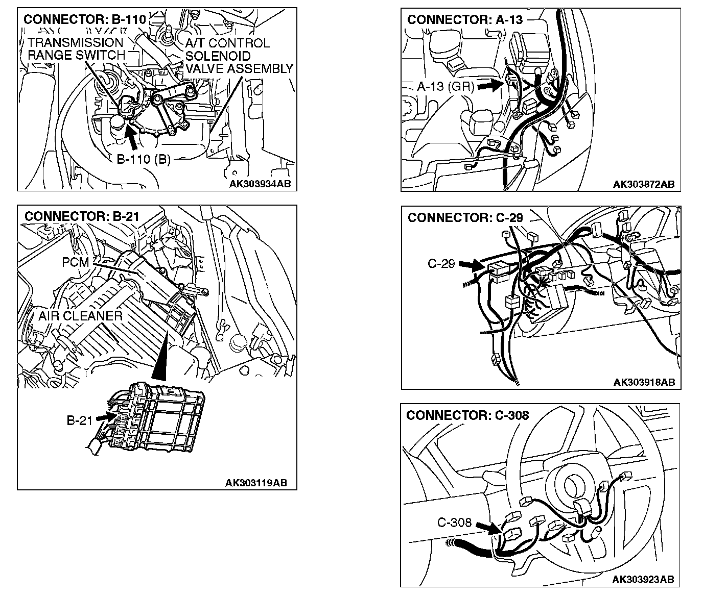 NO: Check connector A-13 and C-29 at intermediate connector for damage, and repair or replace as required. Refer to, Harness Connector Inspection. If intermediate connector are in good condition, repair harness wire between ignition switch connector C-308 (terminal No. 5) and transmission range switch connector B-110 (terminal No. 10) because of open circuit. Then confirm that the malfunction symptom is eliminated.