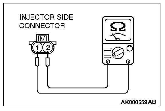 2. Measure the resistance between each injector side connector terminal No. 1 and No. 2.