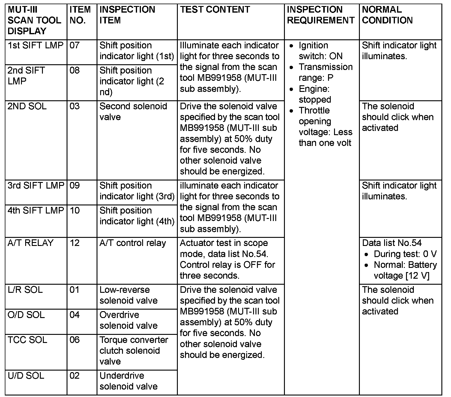 Actuator Test Reference Table