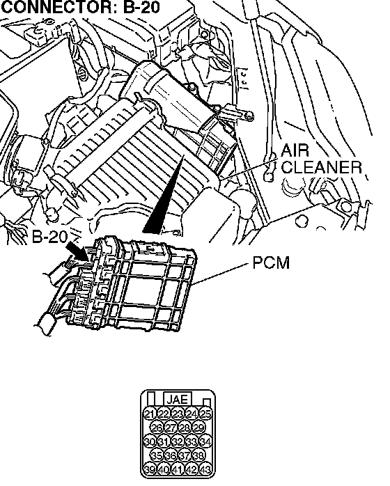 STEP 3. Check PCM connector B-20 for loose, corroded or damaged terminals, or terminals pushed back in the connector.