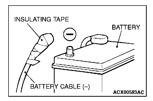 6. Turn the ignition switch to the "LOCK" (OFF) position. Disconnect the negative (-) battery cable and tape the terminal to prevent accidental connection and air bags deployment.