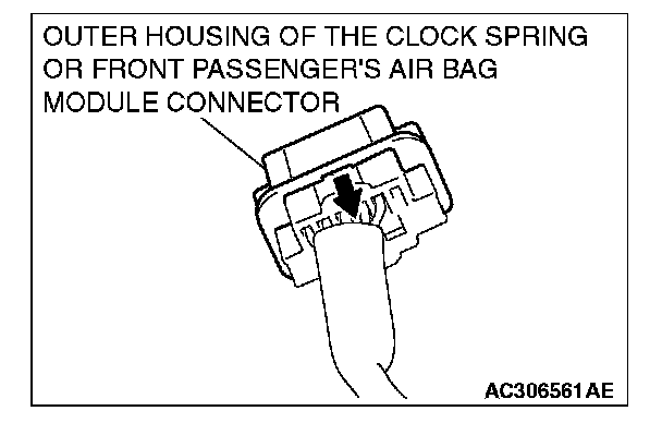 Slide the outer housing of the clock spring or front passenger's air bag module connector in the arrow direction shown, and disconnect the connector.