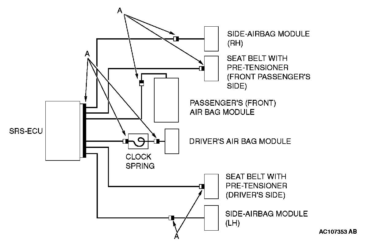 SRS air bag special connectorTo enhance the system reliability, a connector lock switch is integrated in the SRS-ECU connector, the air bag module connectors, the clock spring connector, the seat belt pretensioner connectors (black con nector "A" shown in the illustration).