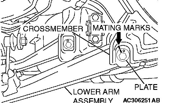Place mating marks on the crossmember and the plate before removing the lower arm bolt.