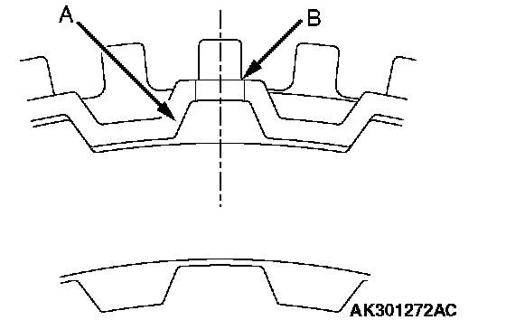 2. Install the clutch reaction plate in the direction shown. Install it the same as the clutch plates, so that the areas with no teeth (marked "A") are aligned with the retainer (marked "B").