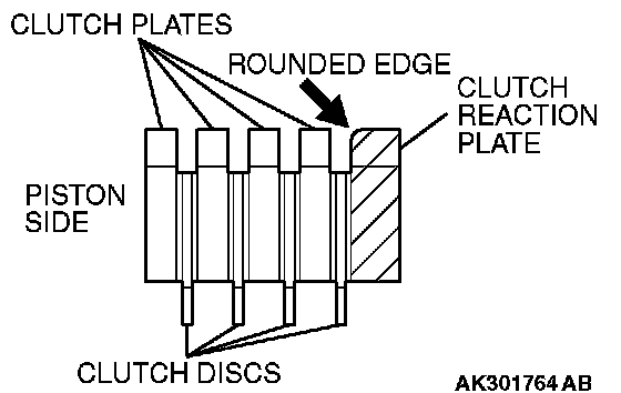 1. Assemble the four clutch plates and four clutch discs one on top of the other inside the underdrive clutch retainer. All four clutch plates should be assembled so that the places with no teeth (marked "A") are aligned with the holes in the retainer (marked "B").