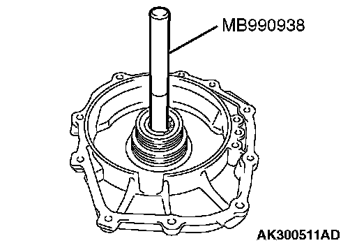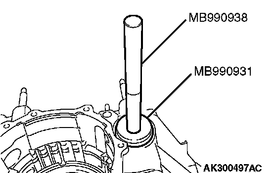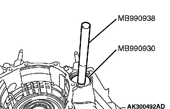22. Use special tools MB990930 and MB990938 to tap the output shaft bearing outer race in the transaxle case.